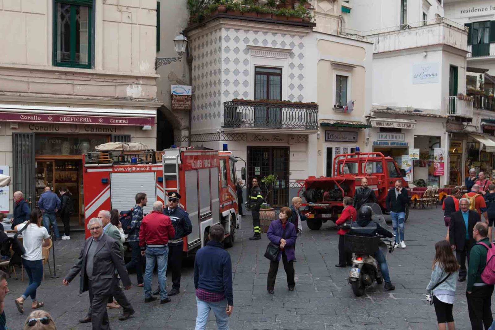 Here the fire department also arrived, driving through the square with lights blazing to attend to what must have been a false alarm.